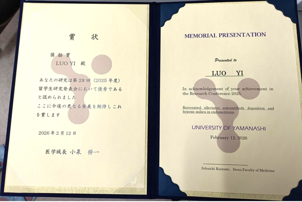 第28回留学生研究発表会にて、大学院生のLuo Yiさん(修士1年)が奨励賞を受賞しました。